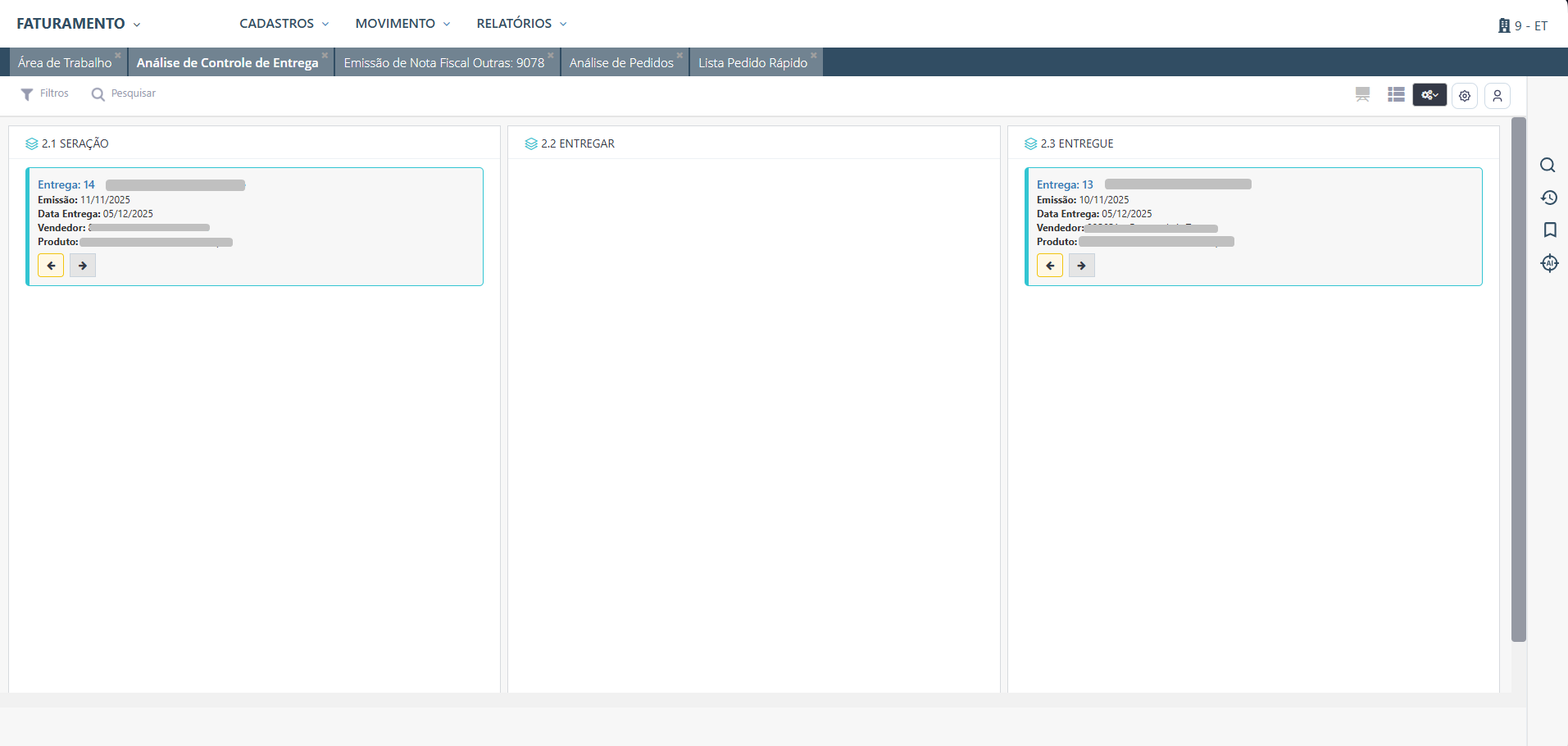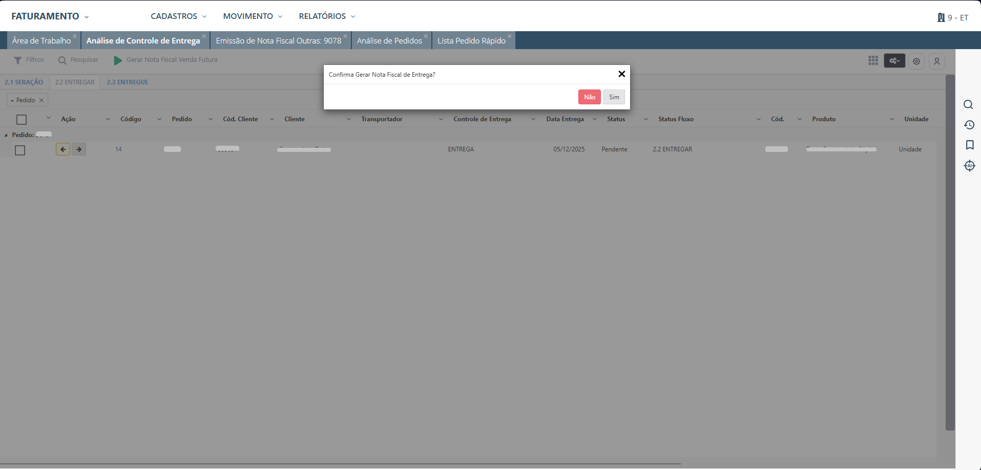 Faturamento > MOVIMENTO > ANÁLISES > Análise de Controle de Entrega