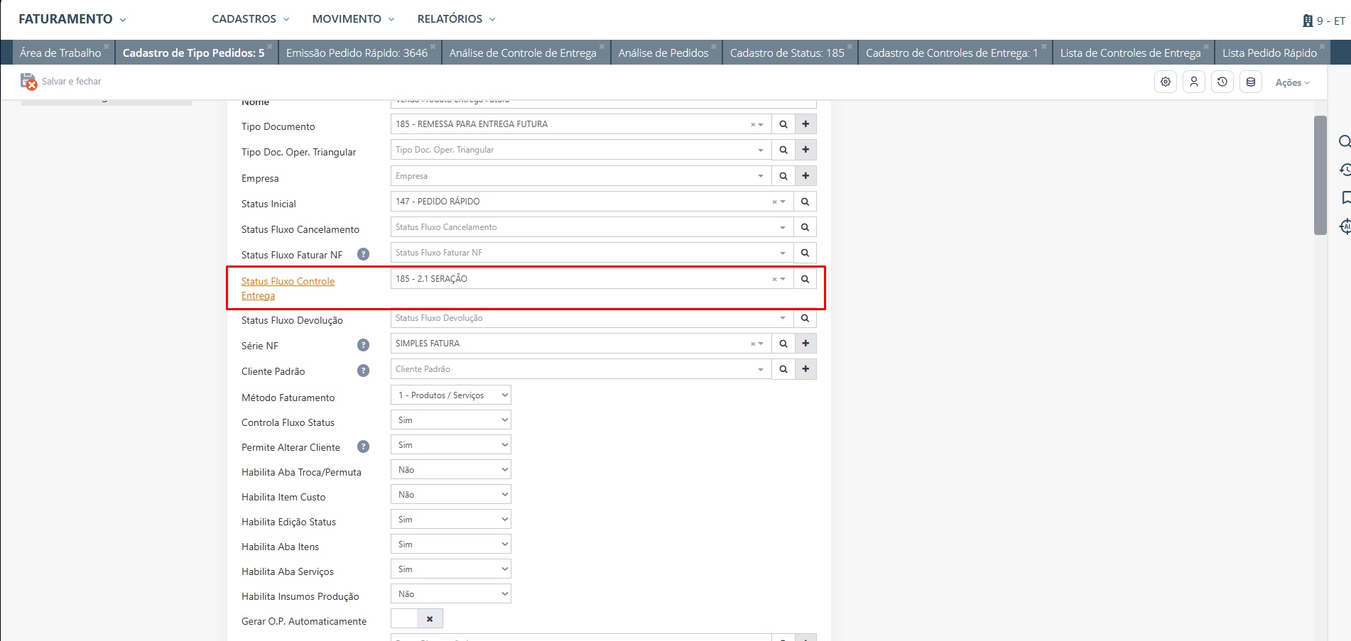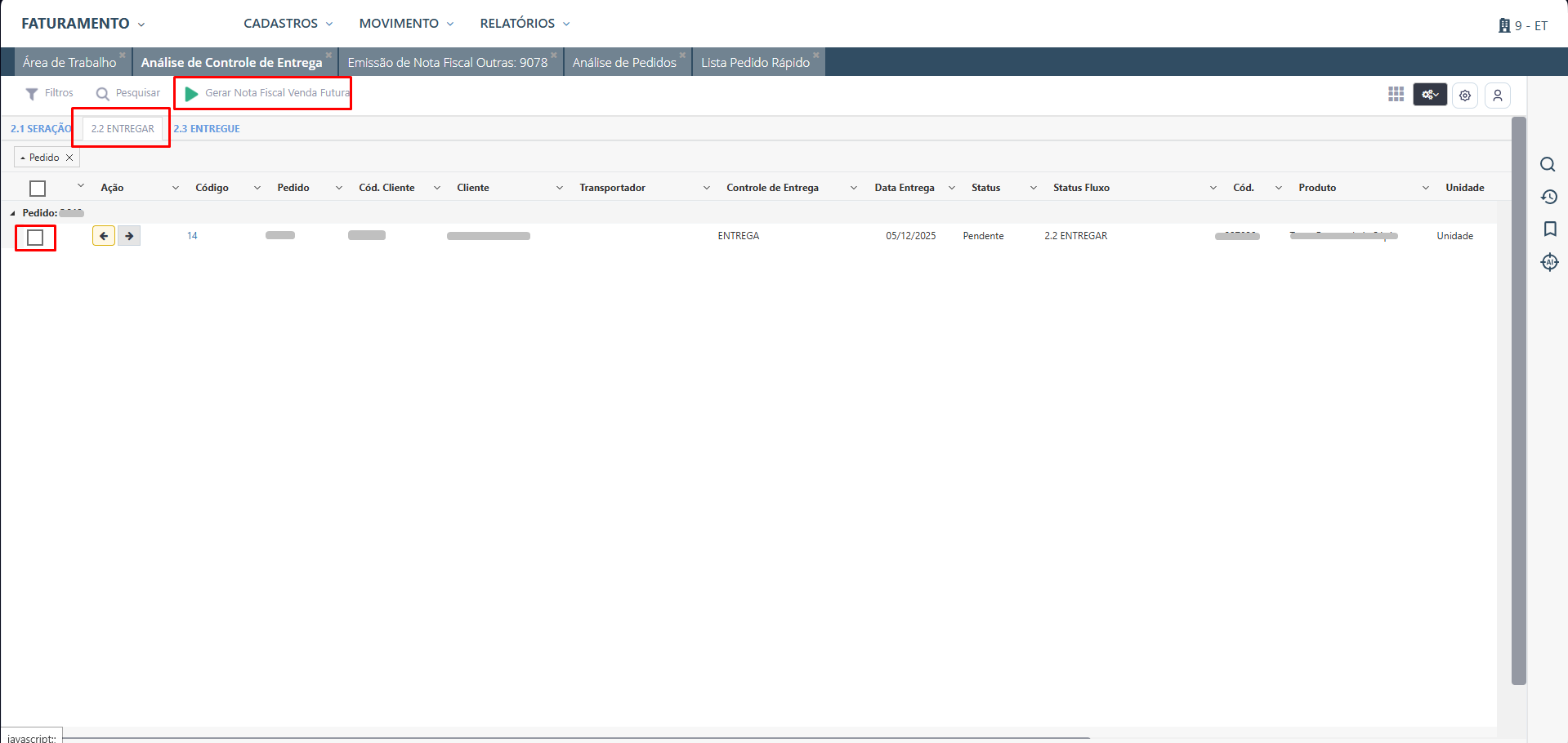 Com a Nota Fiscal de Venda Futura já faturada, pode avançar os status Fluxo do Controle de Entrega até o