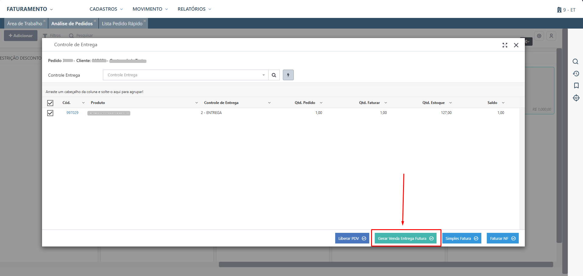 O processo Análise Controle de Entrega ocorre após a finalização do pedido rápido, que é quando já se foi gerado a Nota de Venda Futura.