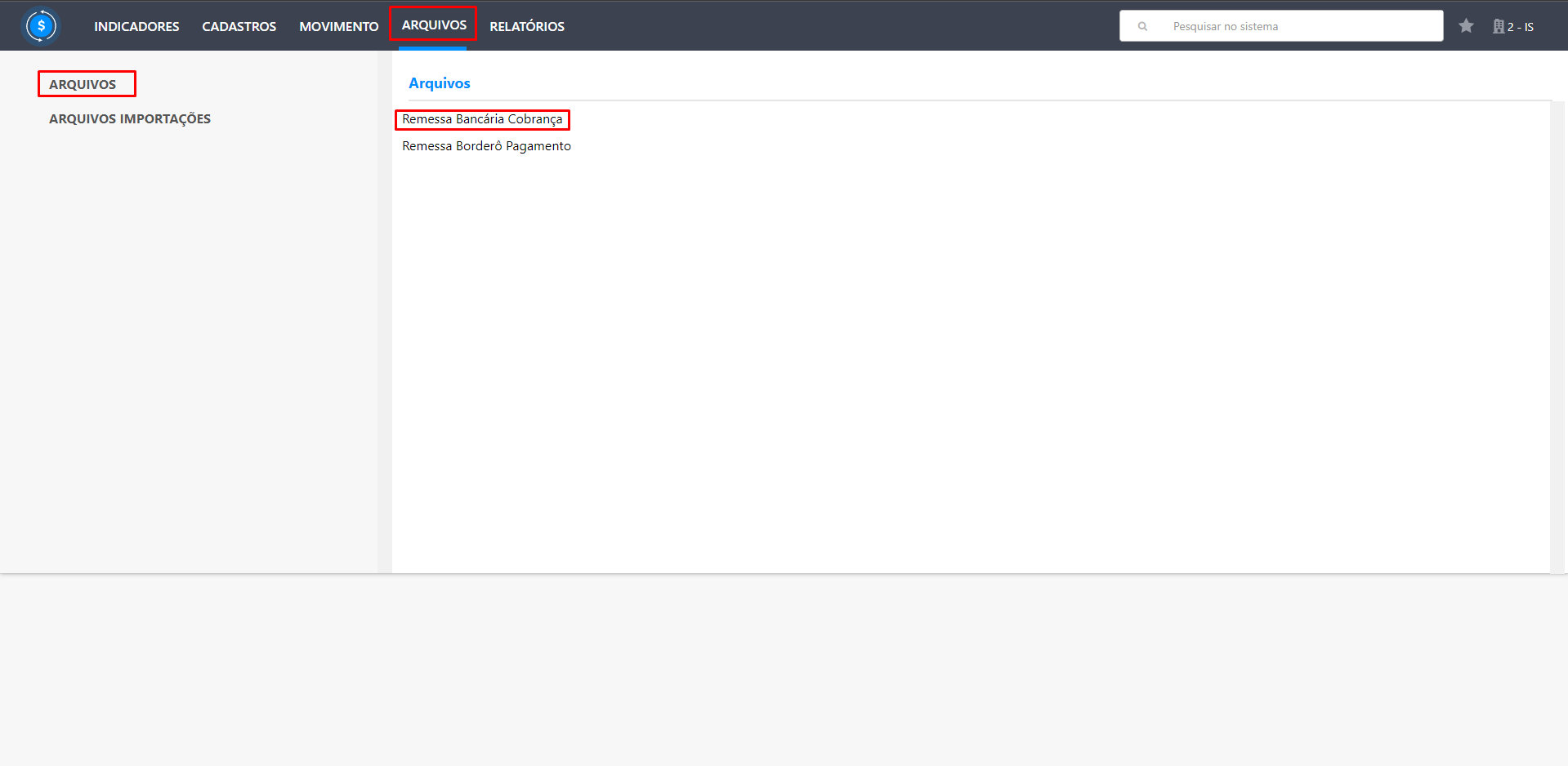 Caminho de Acesso: Financeiro > ARQUIVOS > ARQUIVOS > Remessa Bancária Cobrança