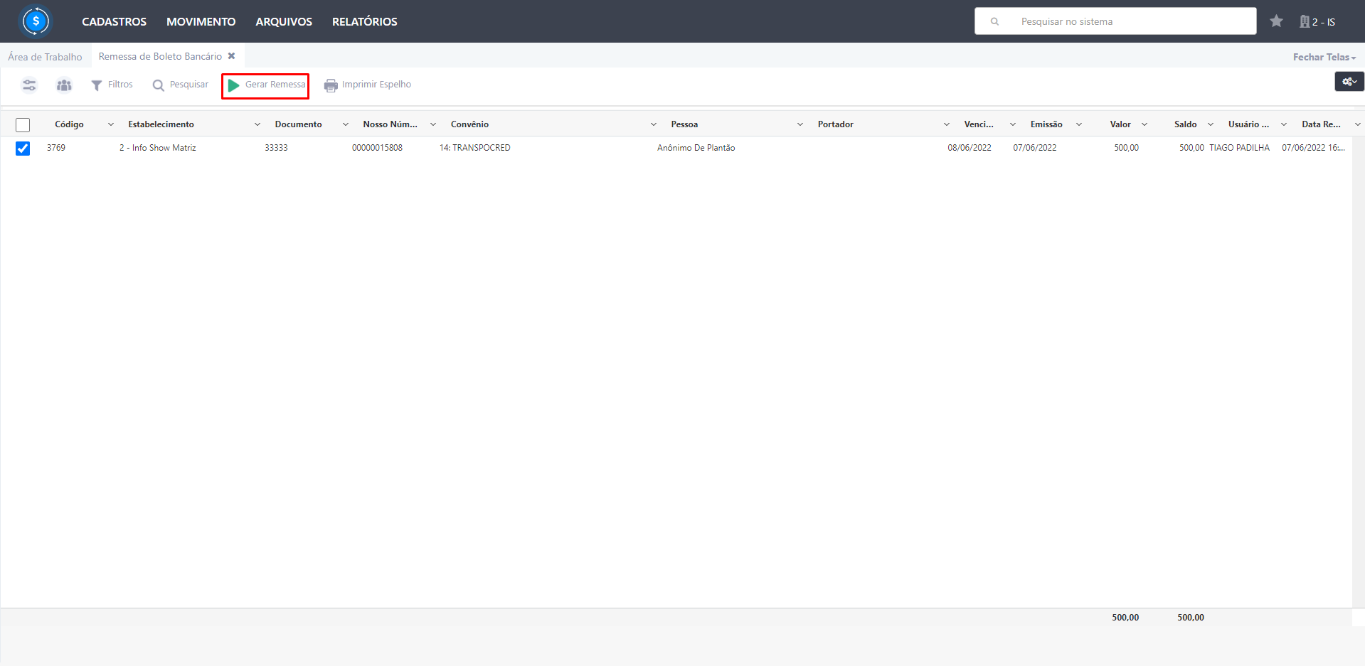 2 - Títulos com Remessa Gerada: Títulos na qual já foram gerados suas respectivas remessas.