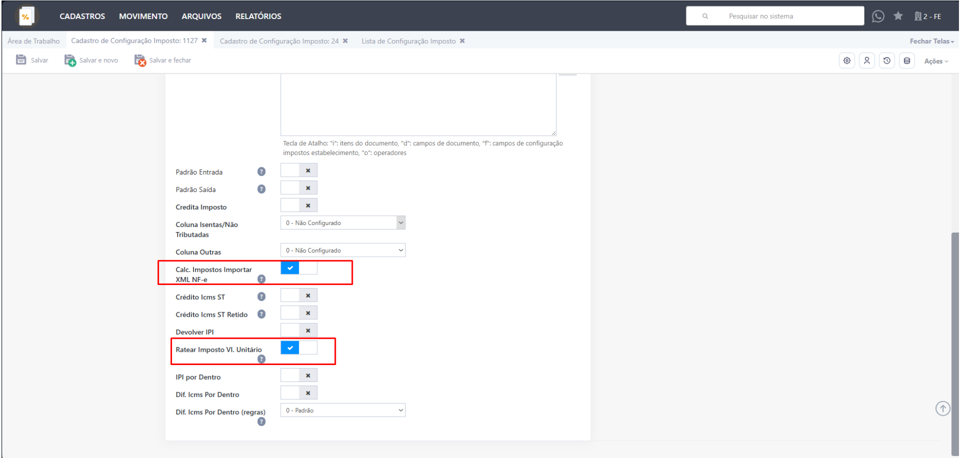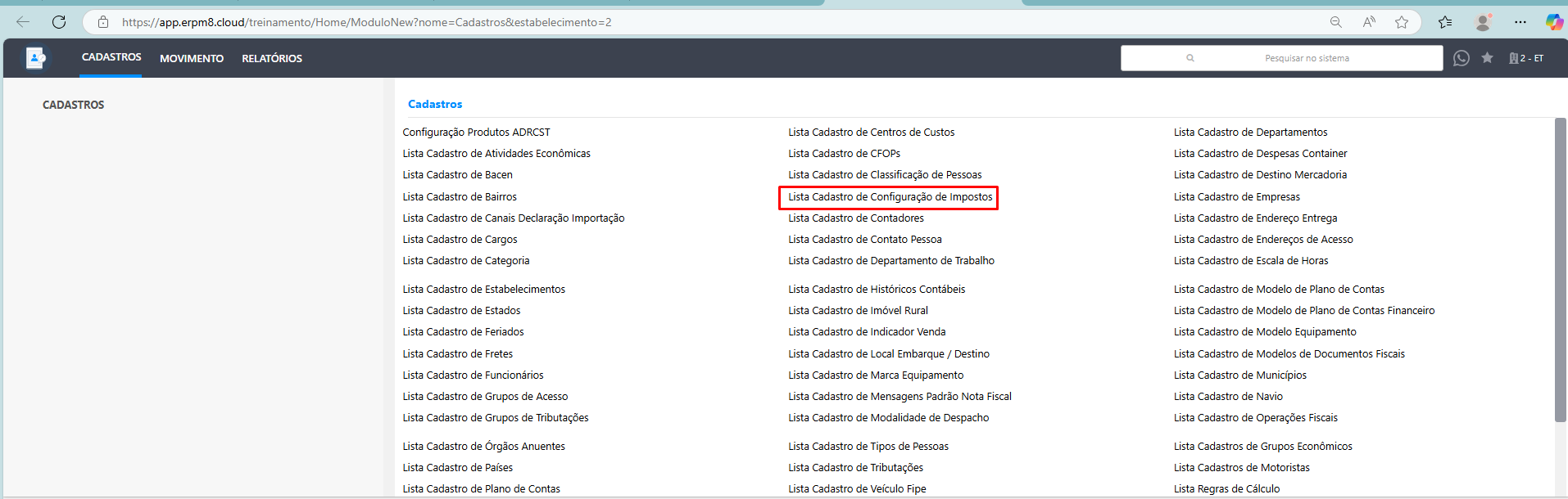 Configurações > CADASTROS > CADASTROS > Lista Cadastro de Configuração de Impostos