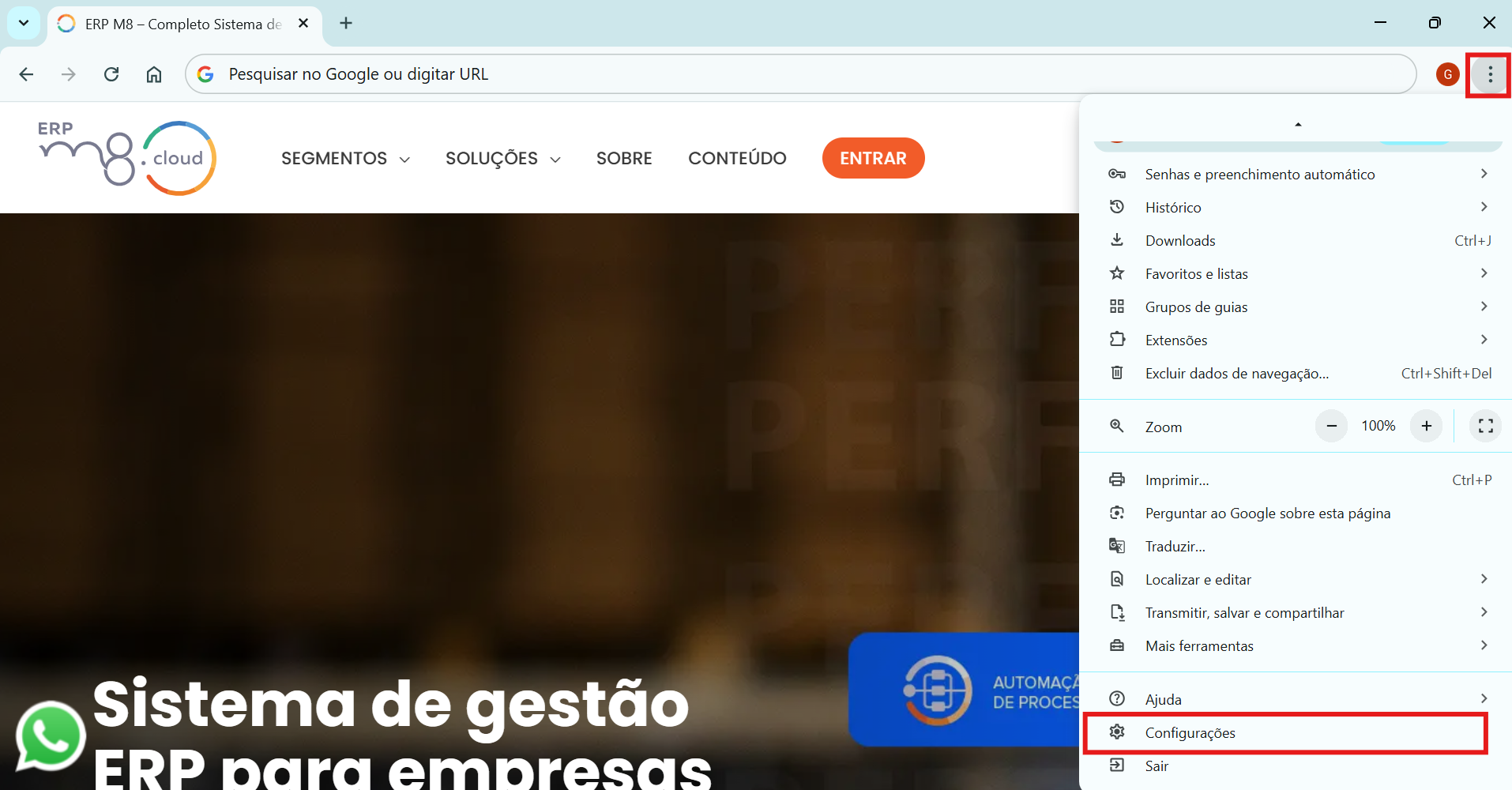 Abra o navegador Google Chrome e clique nos três pontos verticais (⋮) no canto superior direito e selecione "Configurações".