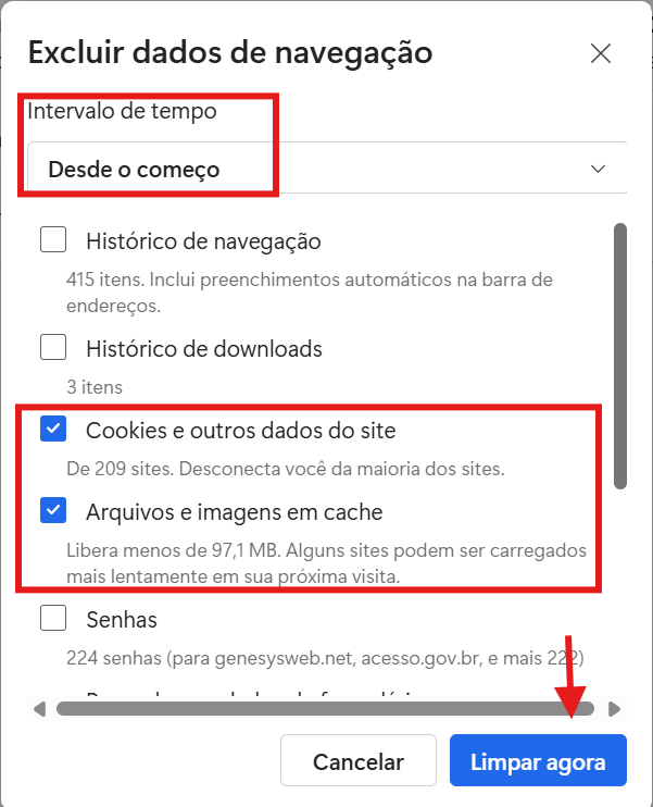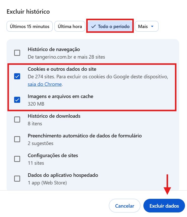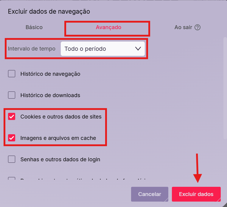 Imagens e arquivos em cache' e 'Cookies e outros dados do site', e clique em