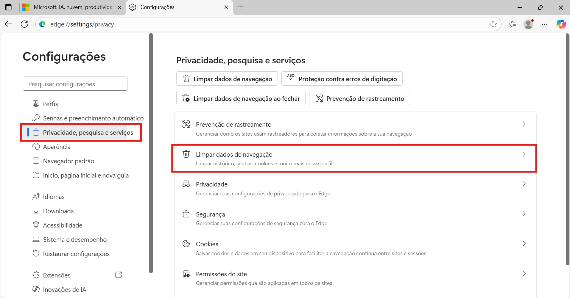 No menu lateral esquerdo, clique em "Privacidade, pesquisa e serviços" e logo após clique em "Limpar dados de navegação"