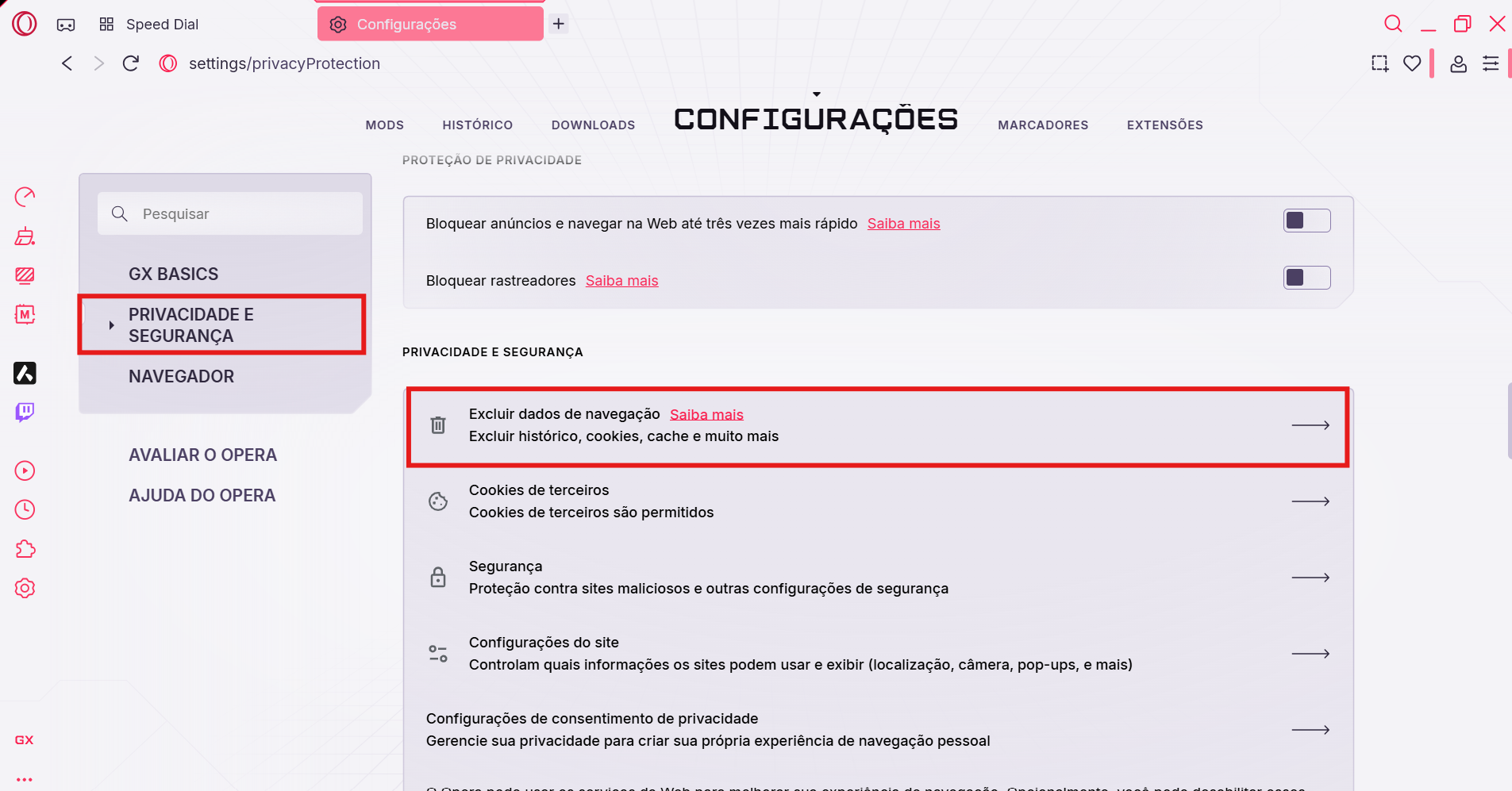 No menu lateral esquerdo, clique em 'Privacidade e segurança' e logo após clique em 'Excluir dados de navegação'.