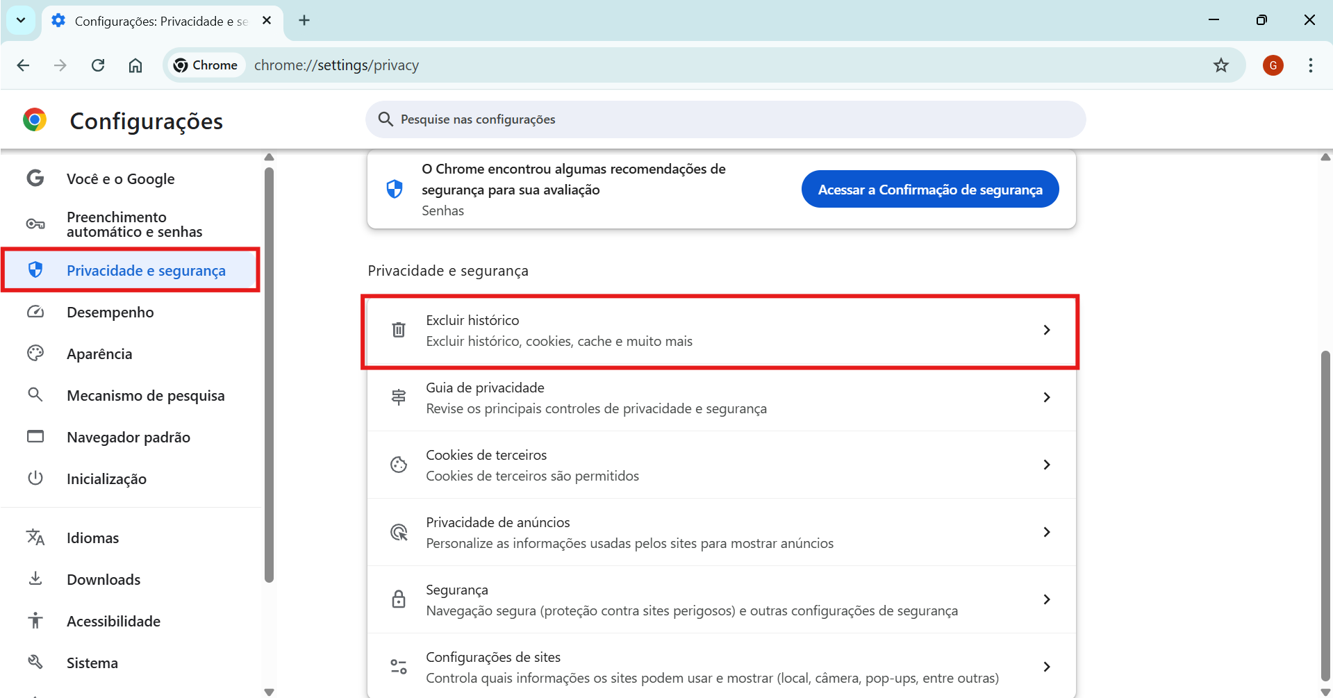 No menu lateral esquerdo, clique em "Privacidade e segurança" e logo após clique em "Excluir histórico"