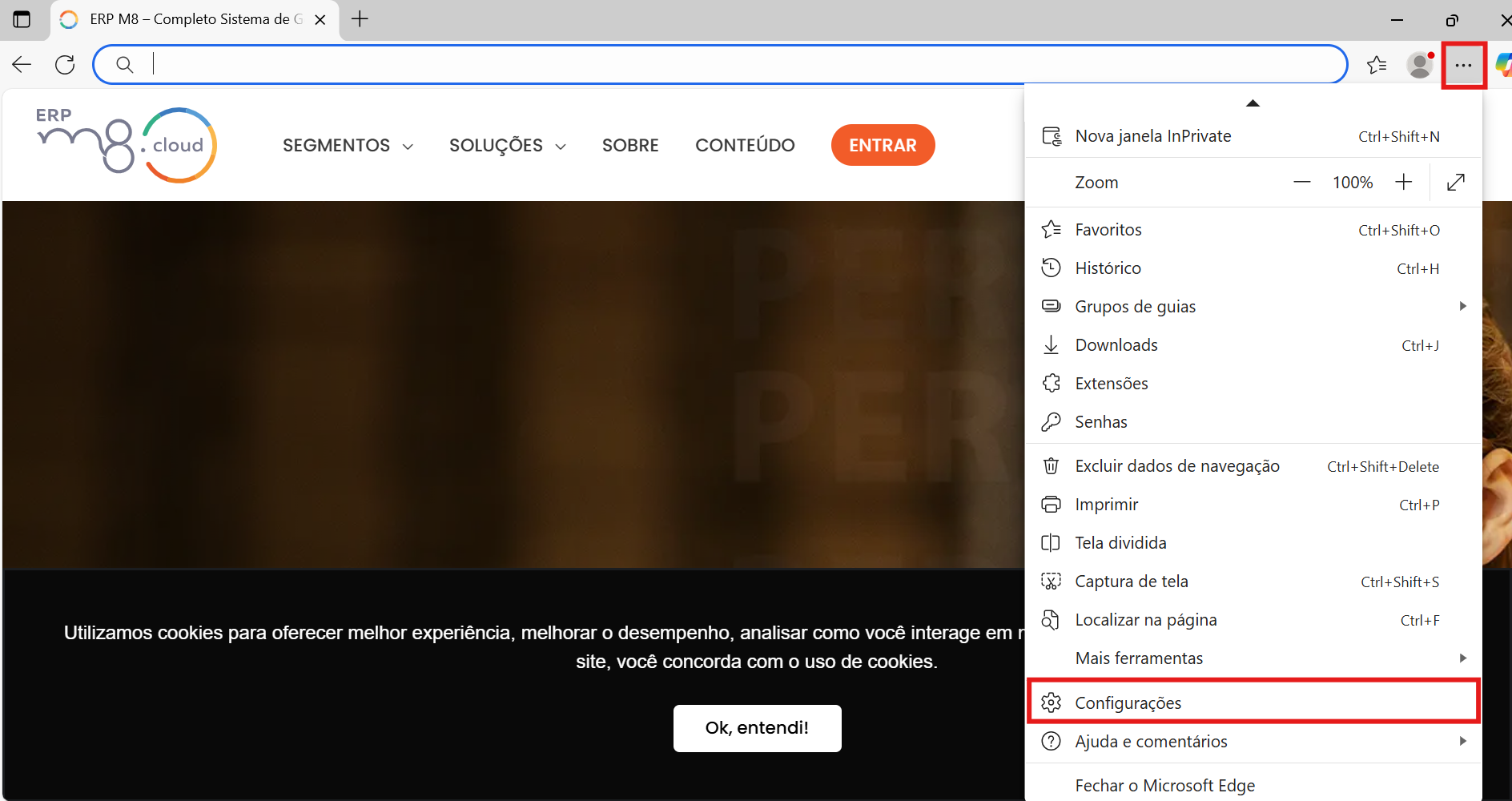 Abra o navegador Microsoft Edge e clique nos três pontos verticais (⋮) no canto superior direito e selecione 'Configurações'.