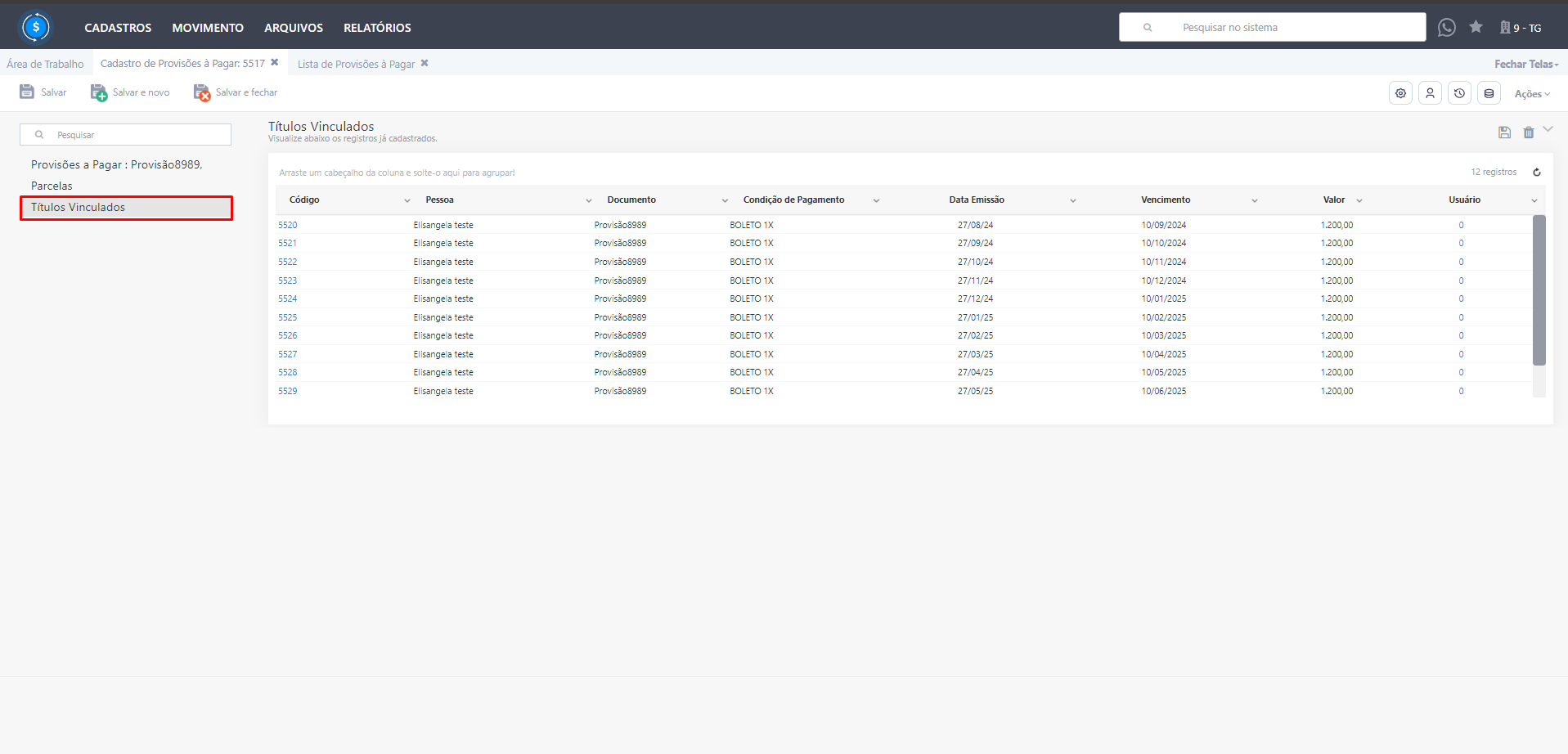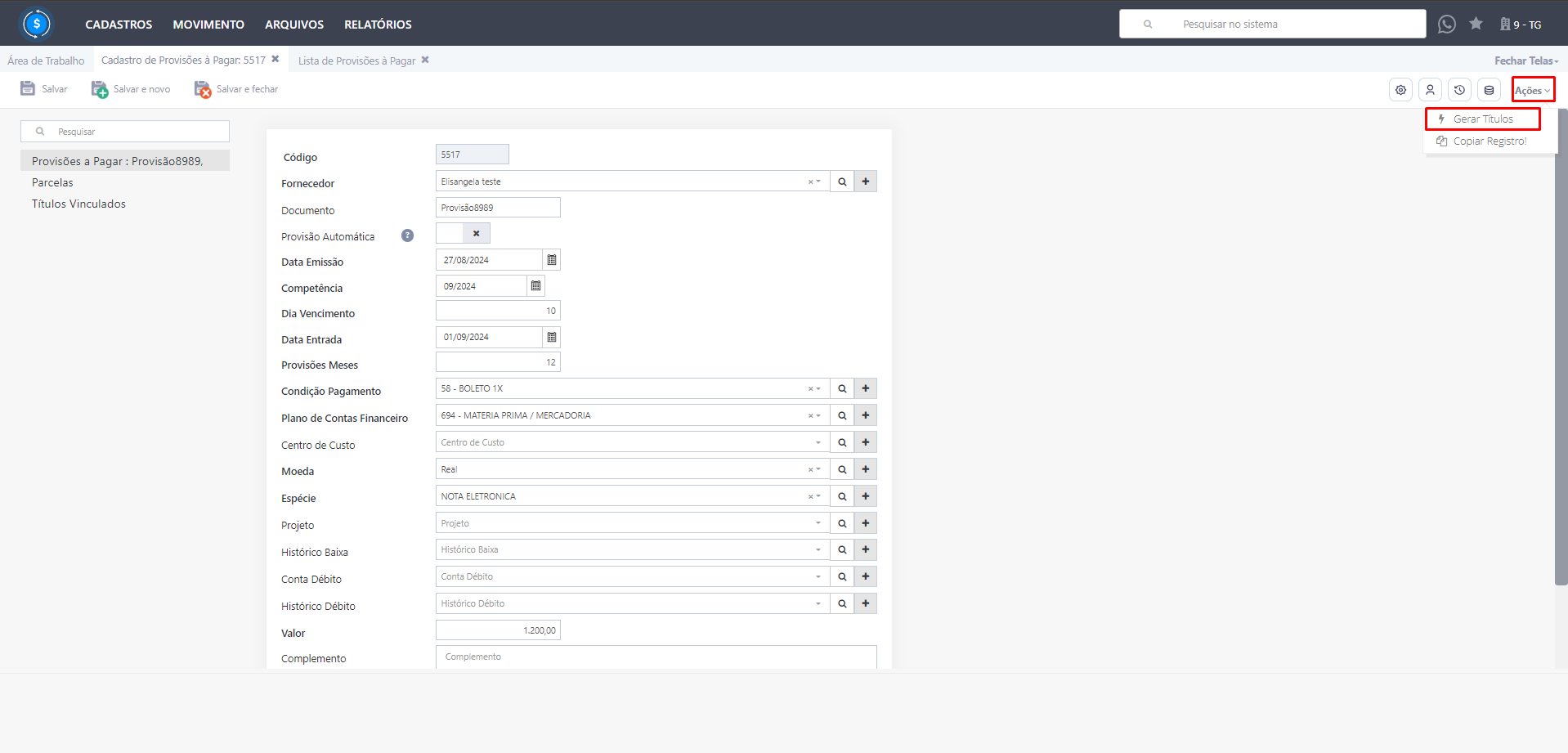 Provisões Meses: Poderá informar por quantos meses será provisionado o valor informado.